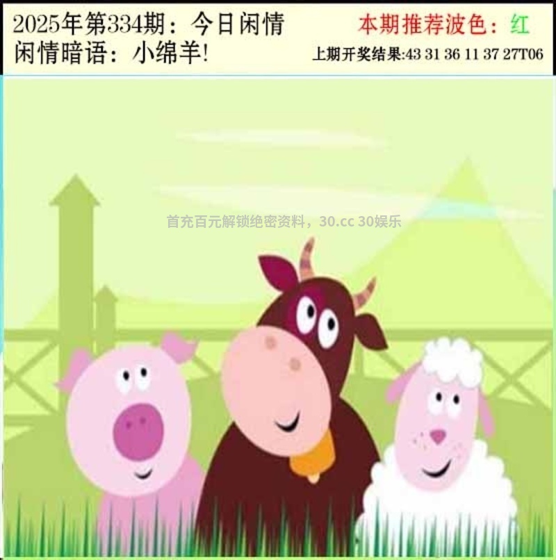 334期今日闲情:【小绵羊】 解释:小绵羊,图解猴羊兔猪狗马牛 综合解肖:猴羊兔猪狗马牛 主推10码:34.46.11.35.27.39.31.20.12.29 |